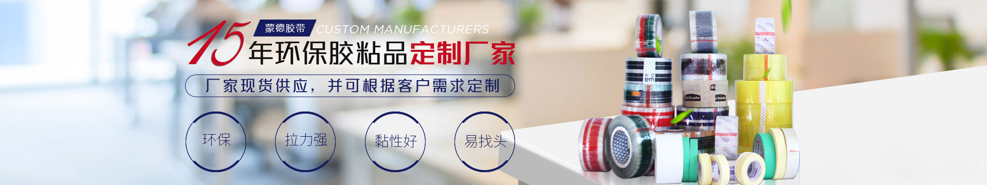 公司始終堅(jiān)持“全力打造(zào)專業化(huà)、標準化膠粘產品生產企業”的企業宗旨。目前主要產品有BOPP透(tòu)明膠帶(dài),超透明辦公膠帶、彩(cǎi)色膠帶、印字膠帶、文具膠帶、美紋紙膠帶、雙麵膠帶(dài)、泡棉雙麵膠帶、大棚PE修補膠帶、電工膠帶(dài)、地毯專用布(bù)基膠帶、PVC警示膠(jiāo)帶等近百個(gè)品種,同時可根據(jù)客戶要求定做多種規格和要求的膠粘產(chǎn)品,滿足客(kè)戶一站式采購的需求。所服務的客戶遍及建材、食品、服裝、電(diàn)子產品、汽車美(měi)容(róng)噴漆、醫藥、消毒(dú)液、化工、家居家裝、五金小商品、電商物流、快遞打包 、農副產品服務等(děng)多個領(lǐng)域(yù)和行業,銷售(shòu)網(wǎng)絡遍布全國各(gè)地(dì)。